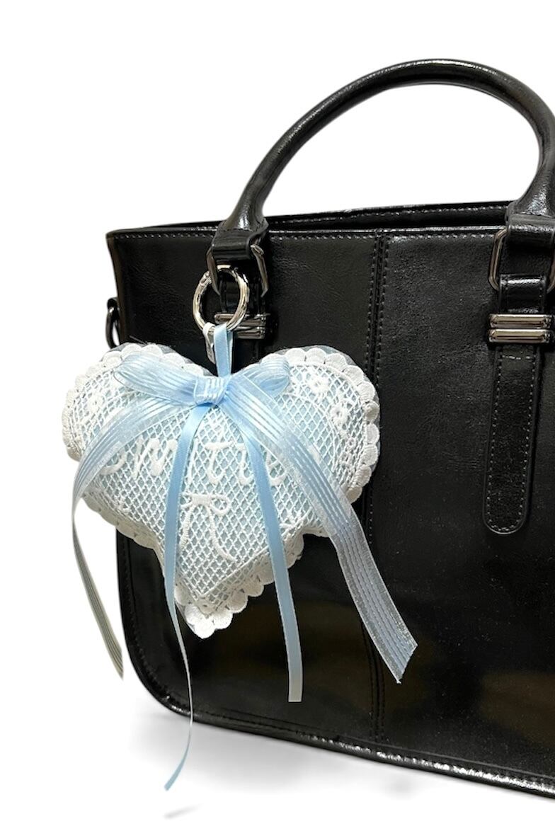 ひとつひとつ手作りのふわふわチャーム、やさしいブルーリボンと繊細なレース模様が特徴的なアイテムです!