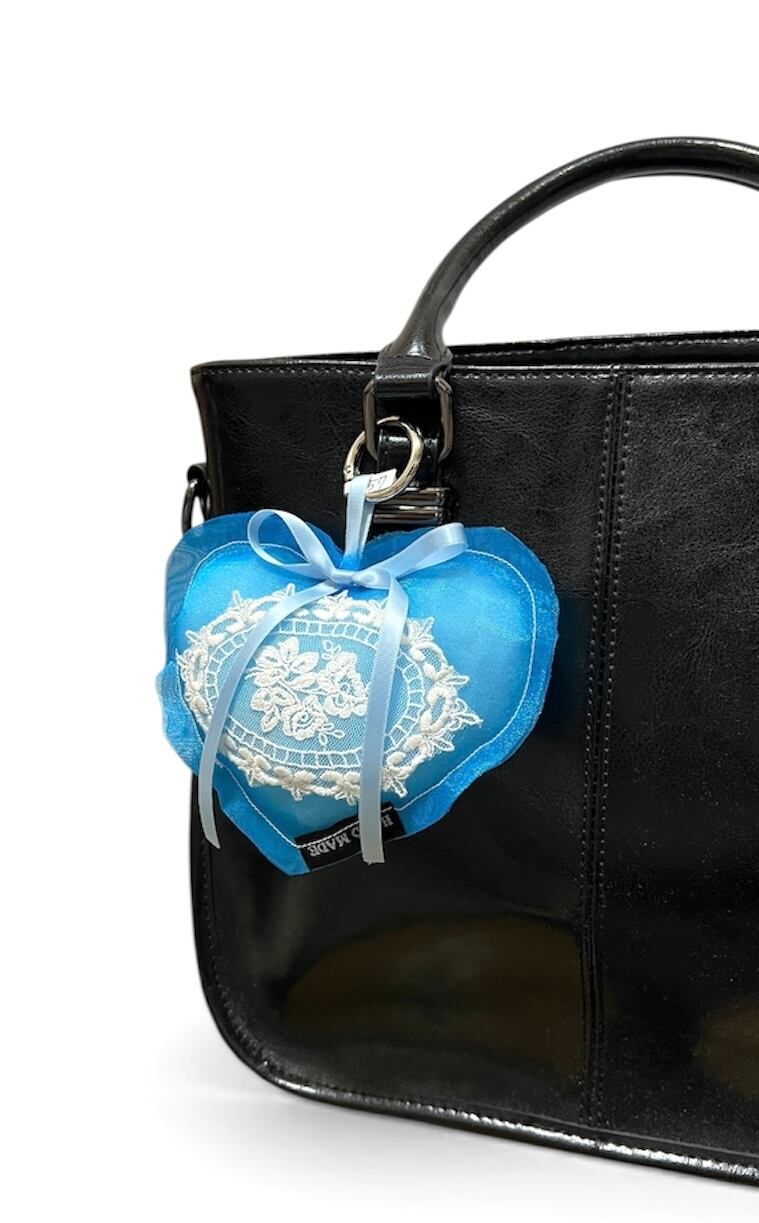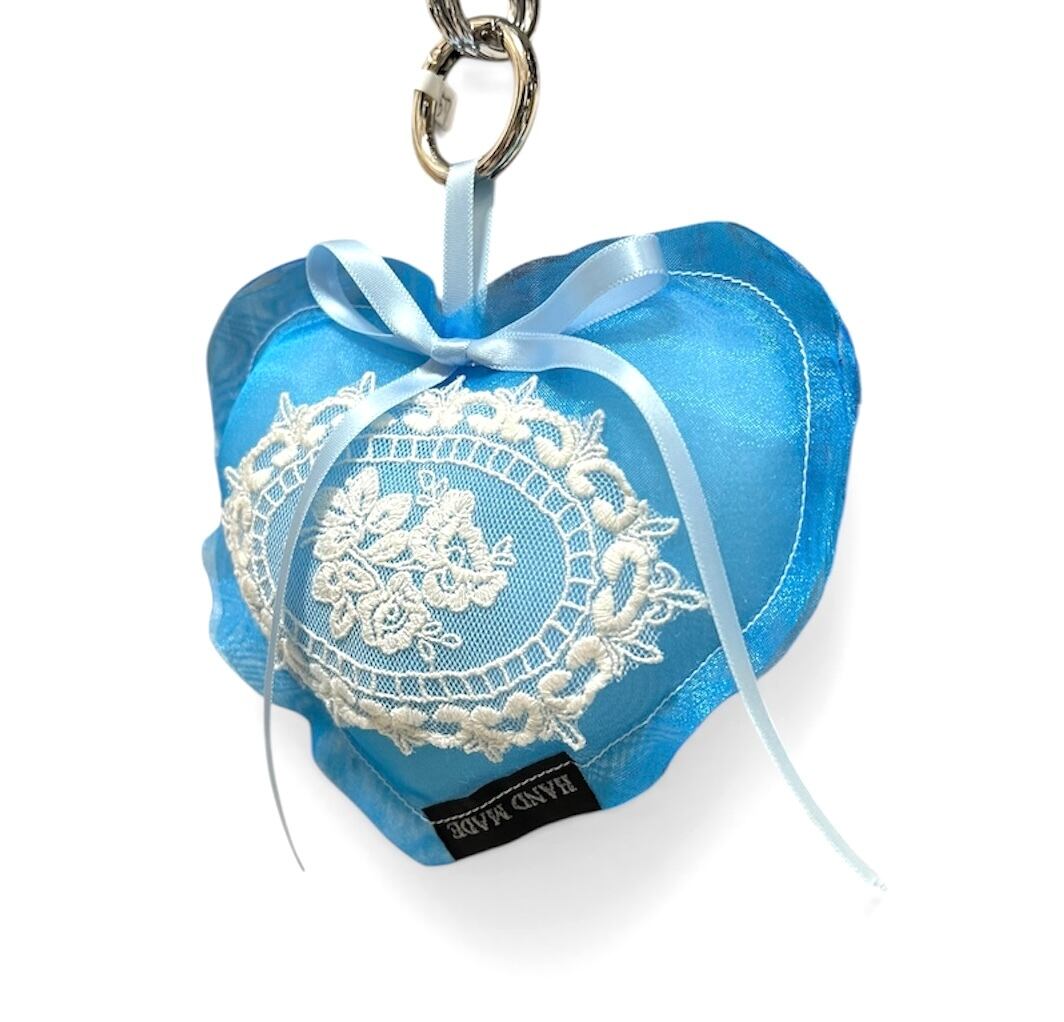 ひとつひとつ手作りのふわふわチャーム、鮮やかなブルーと可愛らしいリボン、繊細なレースが特徴のアイテムです!